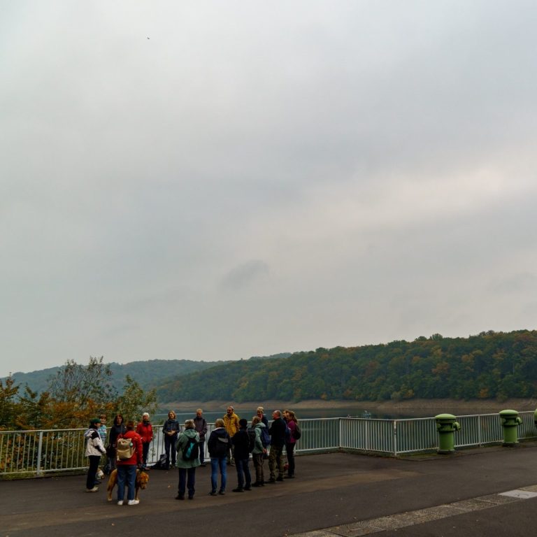 Start einer Wanderung an der Staumauer der Wahnbachtalsperre